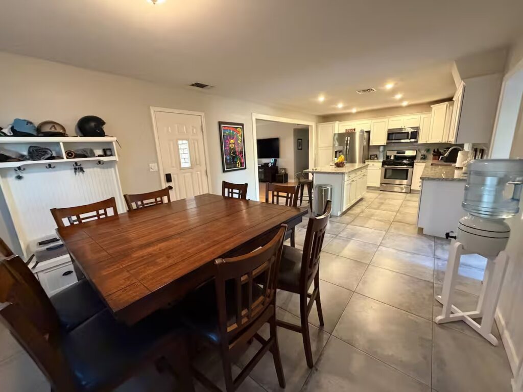 For those who like to cook, the kitchen has a huge kitchen island to prepare food, gas stove top, modern stainless steel appliances including: dishwasher, fridge, coffee maker, quality pots and pans, plates, and utensils.